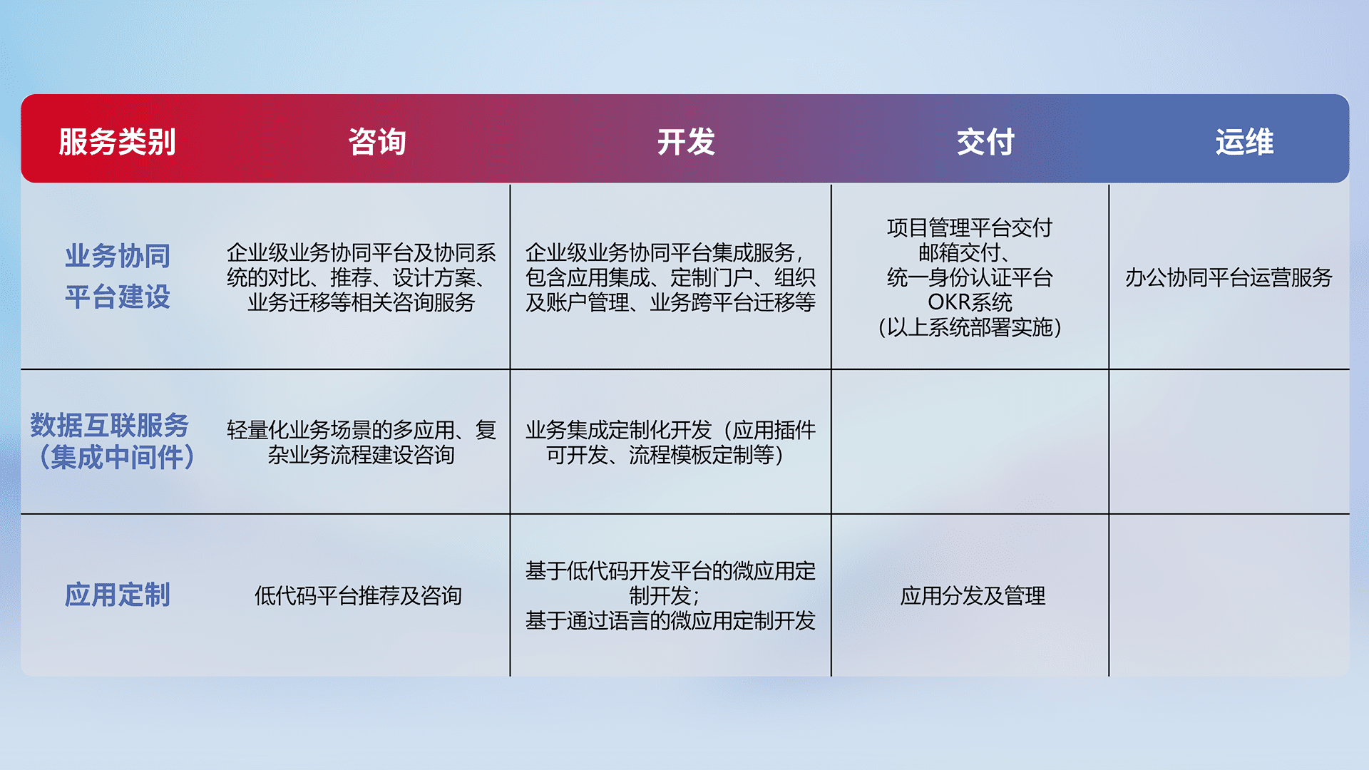 针对钉钉、、、企微、、、、IDaas等平台级产品提供产品的规划、、、方案、、交付、、、定制化开发等服务,,实现如统一协同办公、、、、智能客户服务、、混合会议管理、、、智能数据查询、、、、等业务场景,,,实现数字化转型。。。。